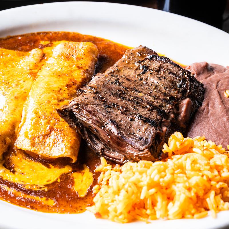 Combination of prime fajita steak, cheese enchiladas, rice, and beans.